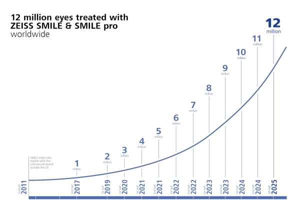 Since its FDA approval in 2016, SMILE laser eye surgery has been an excellent option for patients with nearsightedness, astigmatism, and Contact Lens Intolerance. To date, 12 million ZEISS SMILE procedures have been performed worldwide. Take a look at the graph that shows how fast ZEISS SMILE is gaining popularity!